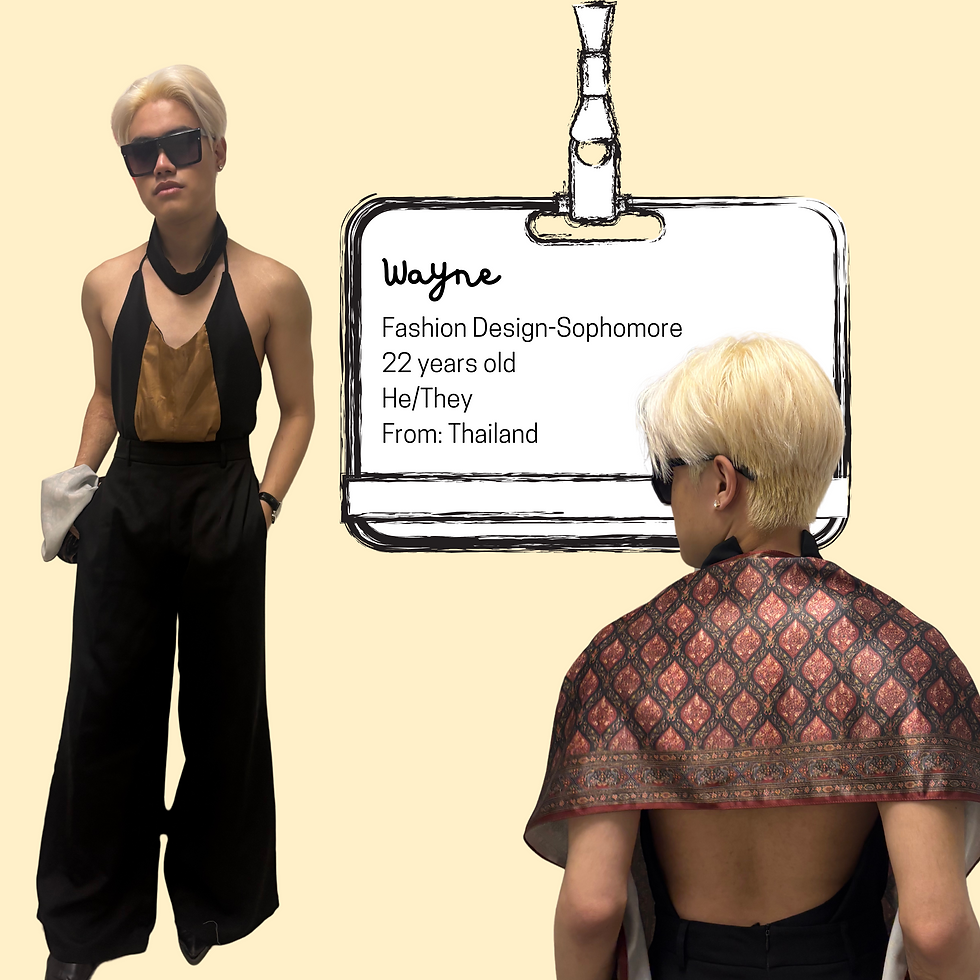 Born in Thailand and now in his third semester of Fashion Design, Wayne brings a global sensibility to his wardrobe—one that fuses the sharp, urban edge of Alexander Wang with the theatrical drama of Alexander McQueen and the unapologetic sensuality of Jean Paul Gaultier. “If I could be the perfect mix of Wang, McQueen, and Gaultier, I’d consider my job done,” he says with a smirk, adjusting the silk scarf he designed himself—an intricate piece inspired by ancient Thai culture.