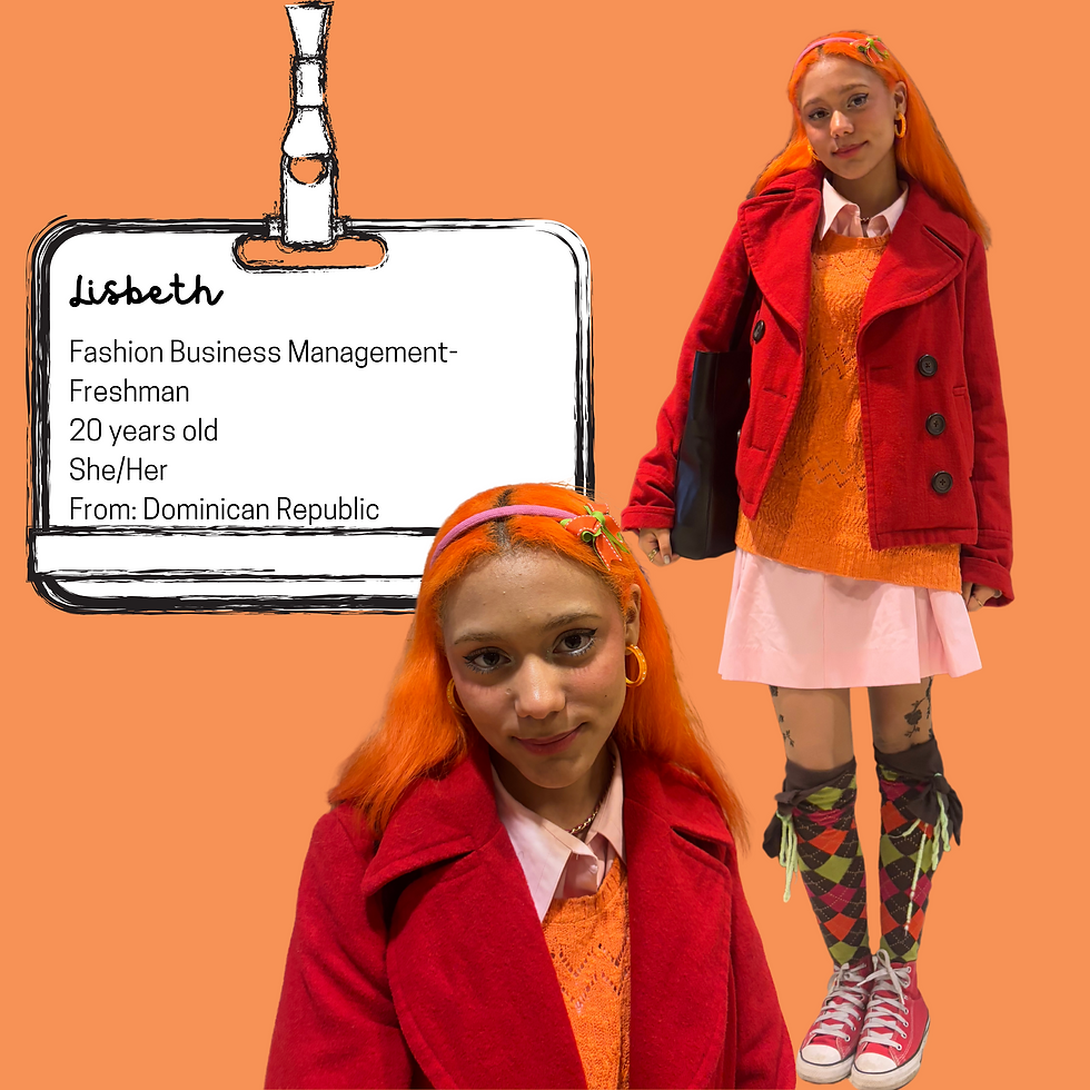 Lisbeth sways through FIT’s campus with a fiery energy that mirrors her flaming orange hair—bold, bright, and impossible to ignore.