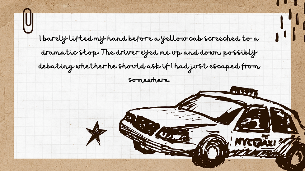 I barely lifted my hand before a yellow cab screeched to a dramatic stop. The driver eyed me up and down, possibly debating whether he should ask if I had just escaped from somewhere. Ultimately, he decided against it. He just unlocked the door. Efficiency at its finest.